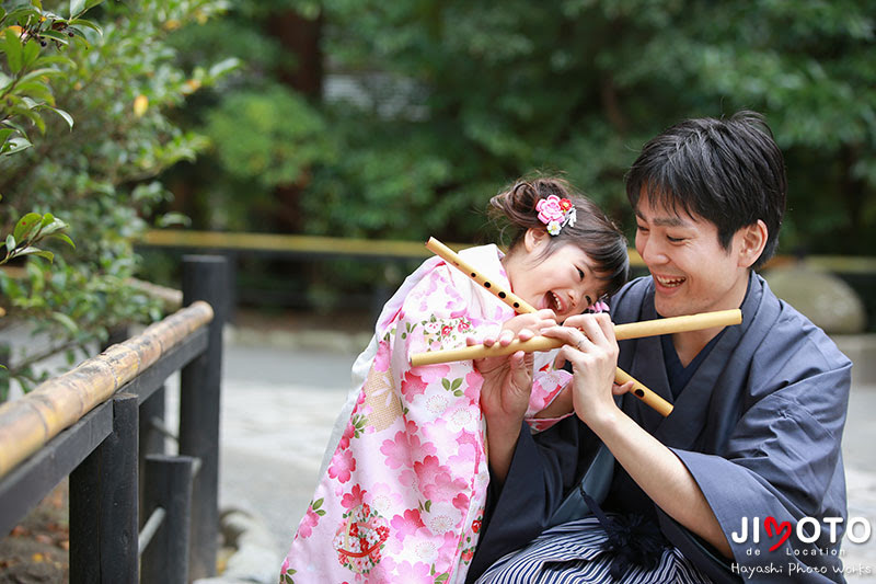 お父さん、お母さんのご結婚式の前撮りでは、お父さんの趣味である篠笛を持って撮影したのですが、今回も持って来て頂いた、お子様も篠笛を持って、親子共演を撮ってみました。もちろんお子様はまだ吹くことが出来ませんが、お父さんと同じ篠笛を持ってはしゃぐお子様と、お父さんの様子、こんな時間が写真に残るって、本当に良いですね!
